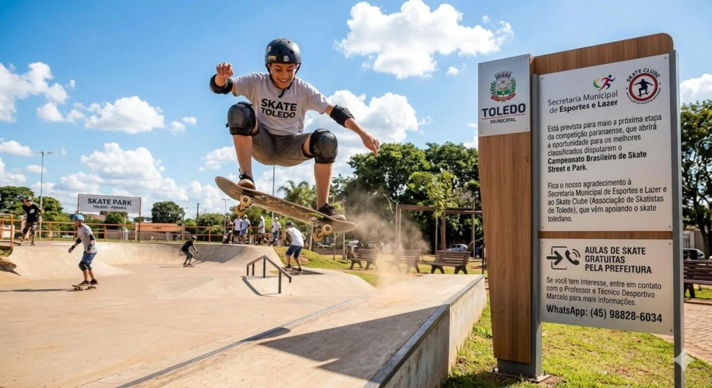Interessados em aprender skate podem participar das aulas gratuitas oferecidas pela Associação de Skatistas de Toledo, em parceria com a Secretaria de Esportes. Informações podem ser obtidas via WhatsApp pelo número (45) 98828-6034.
