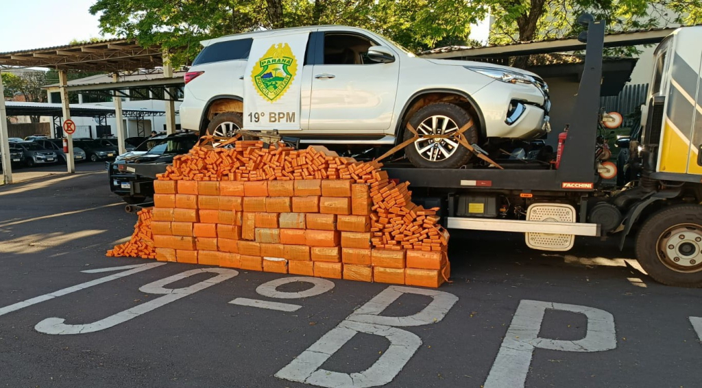 Dentro do veículo, os policiais localizaram a grande quantidade de entorpecentes e a arma de uso restrito escondida entre os fardos. Durante a checagem, também foi constatado que a caminhonete havia sido roubada em Cascavel no dia 11 de julho deste ano.