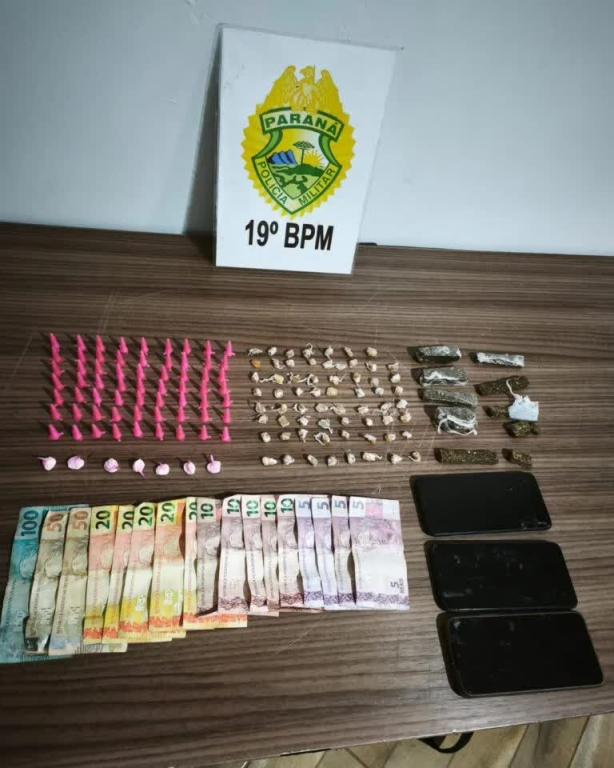 Na sequência, os policiais realizaram buscas na residência indicada. No interior do imóvel, um homem maior de idade foi encontrado com 30 pedras de crack e 25 pinos de cocaína. A proprietária da casa também estava no local no momento da ação.